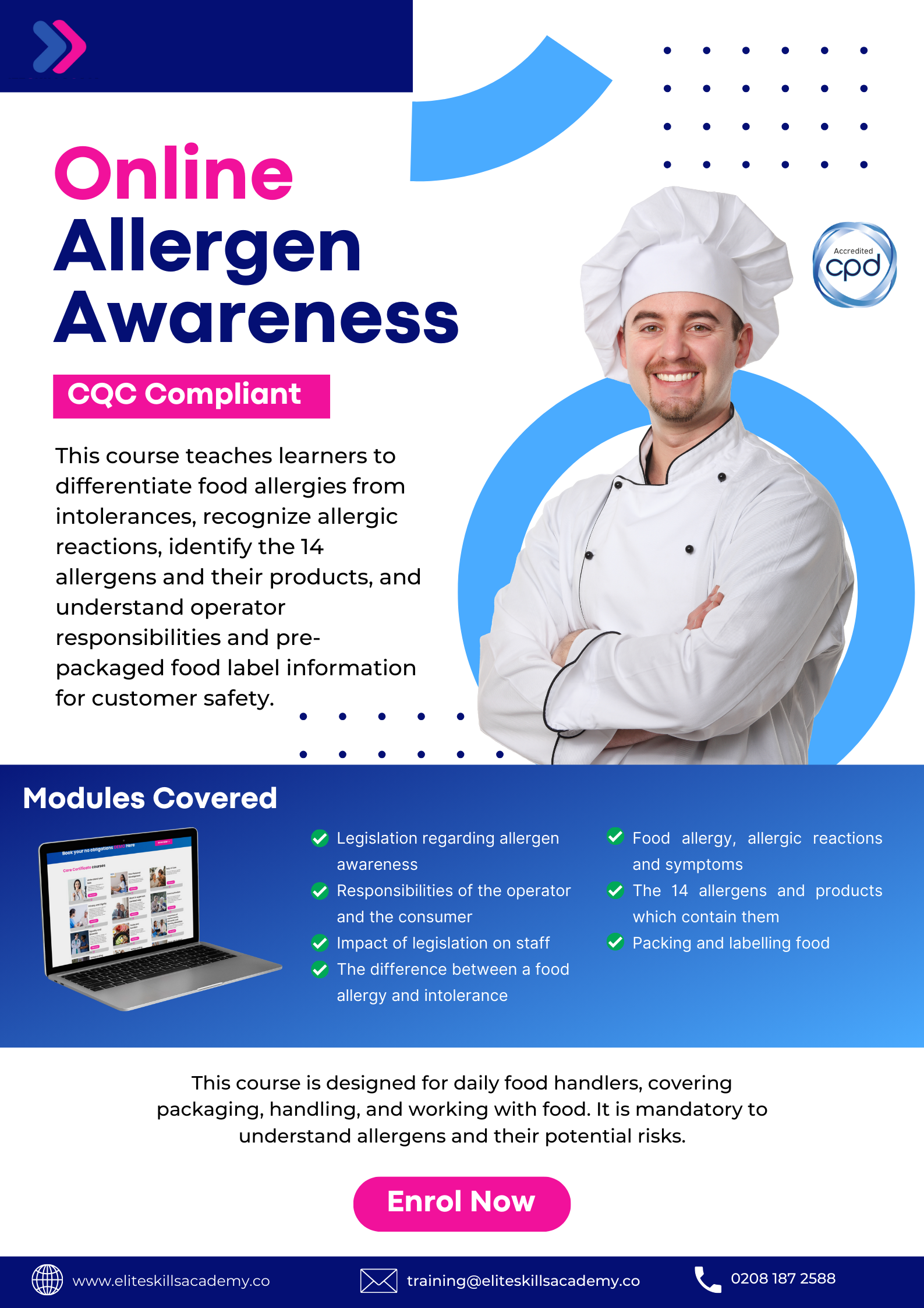 This comprehensive Allergen course targets individuals involved in various aspects of food handling, including food production, packaging, distribution, processing, food retail, and catering.